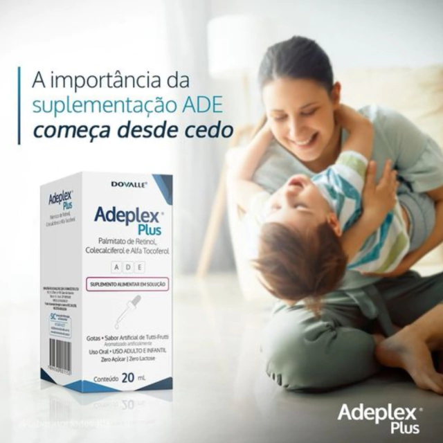 Adeplex Plus é um suplemento alimentar, em gotas, formulado por meio da conjugação de três vitaminas lipossolúveis (A, D e E). Uso infantil e adulto Indicado para prevenção e tratamento de quadro de hipovitaminose especifica relacionadas a vitaminas lipossolúveis A,D e E.