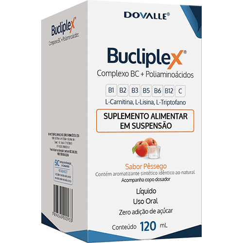 Bucliplex é um suplemento alimentar, em solução, formulado a partir de um complexo de 7 vitaminas associadas a Carnitina, Lisina e Triptofano.