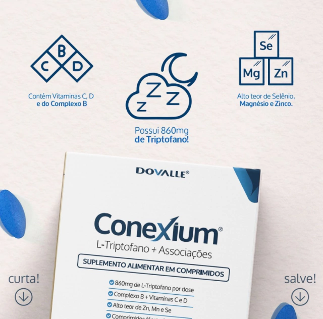 Conexium é um suplemento alimentar à base de L-Triptofano associado a micronutrientes coadjuvantes. Possui 9 vitaminas e um alto teor de zinco, manganês e selênio.