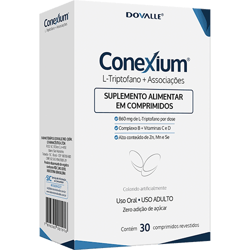 Conexium é um suplemento alimentar à base de L-Triptofano associado a micronutrientes coadjuvantes. Possui 9 vitaminas e um alto teor de zinco, manganês e selênio.